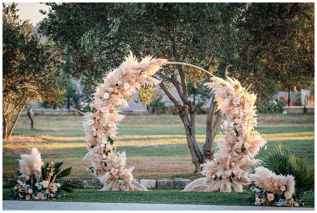 Ein runder oder hexagon-förmiger Traubogen bietet einen eleganten und zeitlosen Stil. Die symmetrische Form bietet eine hohe Stabilität und ermöglicht die Blumendekoration sehr variabel anzubringen. Daher wird dieser besonders im Boho-Stil gerne üppig mit Pampasgras, Trockenblumen oder auch frischen Rosen dekoriert, denn damit wird er zum absoluten Hingucker. Ganz egal ob ihr auch einem alten Weingut, am Meer oder in einer privaten Villa heiratet – ein runder Traubogen passt immer.