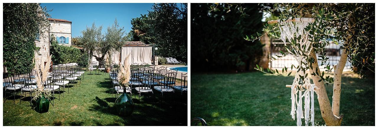 Bei einer freien Trauung bietet es sich oftmals an, die Natur mit einzubinden. Dafür kann beispielsweise ein großer Baum mit einem Schleier aus Stoff und Blumen dekoriert werden. Denn so entsteht eine romantische Atmosphäre bei absolut natürlicher Schönheit. Besonders in Kroatien bieten sich oft Olivenbäume und Olivenzweige zur Dekoration an. So übernehmt ihr die Besonderheiten des Landes direkt mit in eure Zeremonie und schafft eine nachhaltige Alternative.