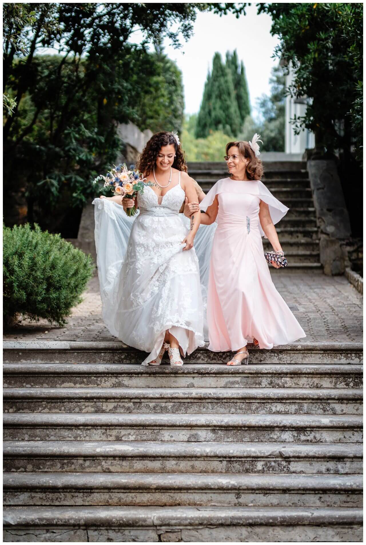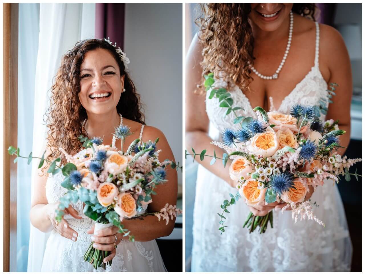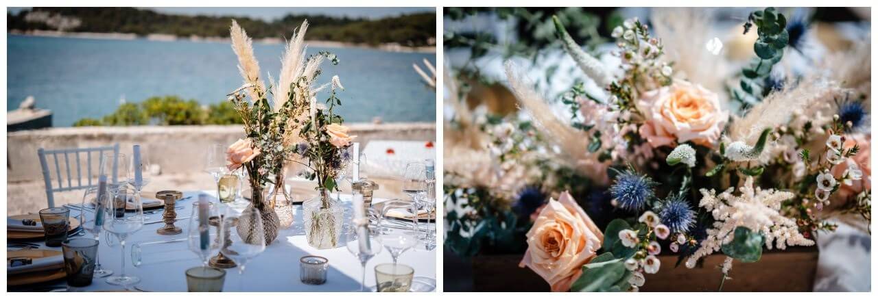 Also entschieden wir uns passend für ein Boho Hochzeitskonzept, jedoch nicht ausschließlich in den klassischen weiß und Sandtönen. Wir kombinierten Pampasgras und Eukalyptus mit pfirsichfarbenen Sommerblumen und blauen Disteln – ähnlich zur präsenten Farbe des Meeres, denn die Boho Hochzeit in Rovinj fand in Kroatien direkt an der Adria statt.
