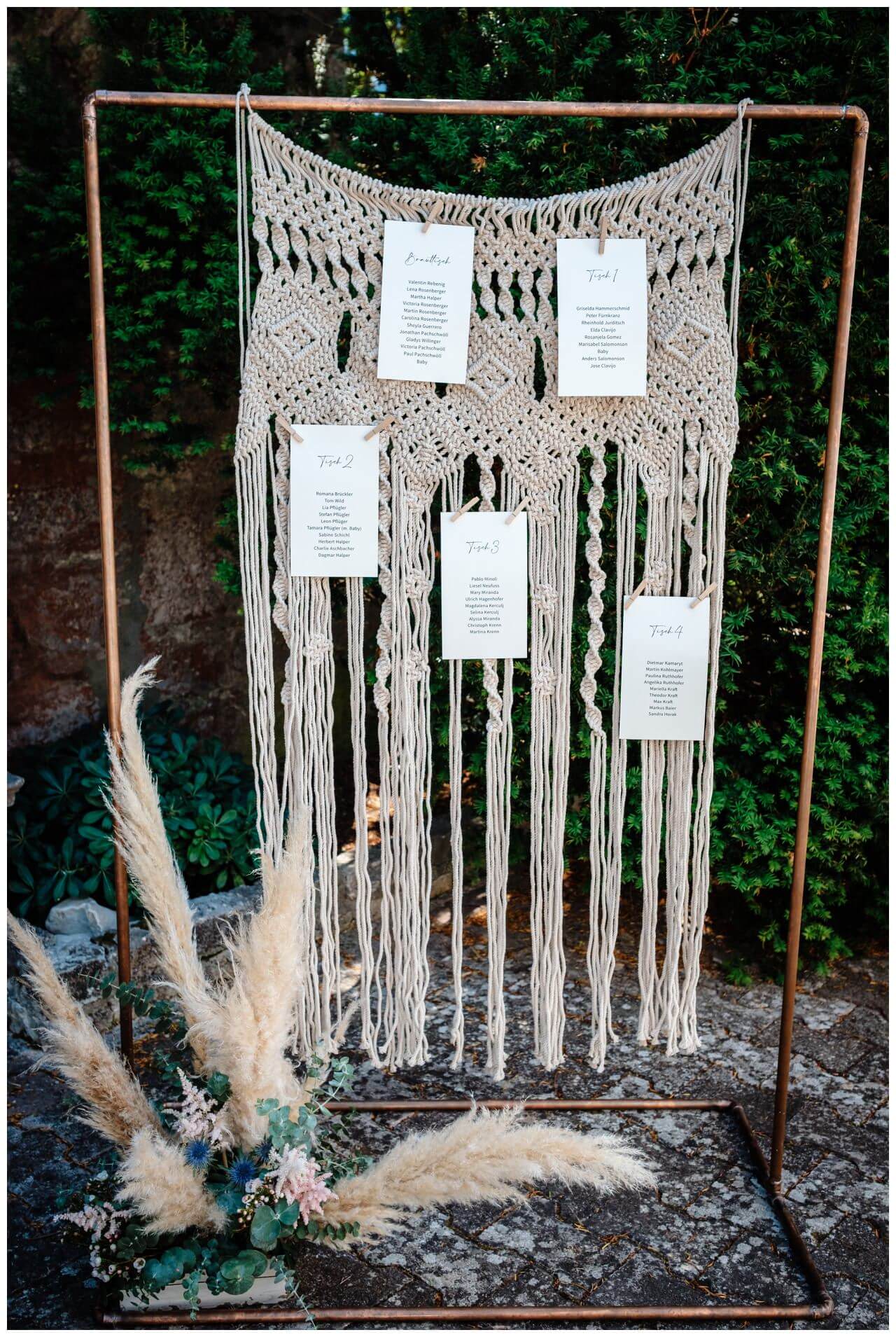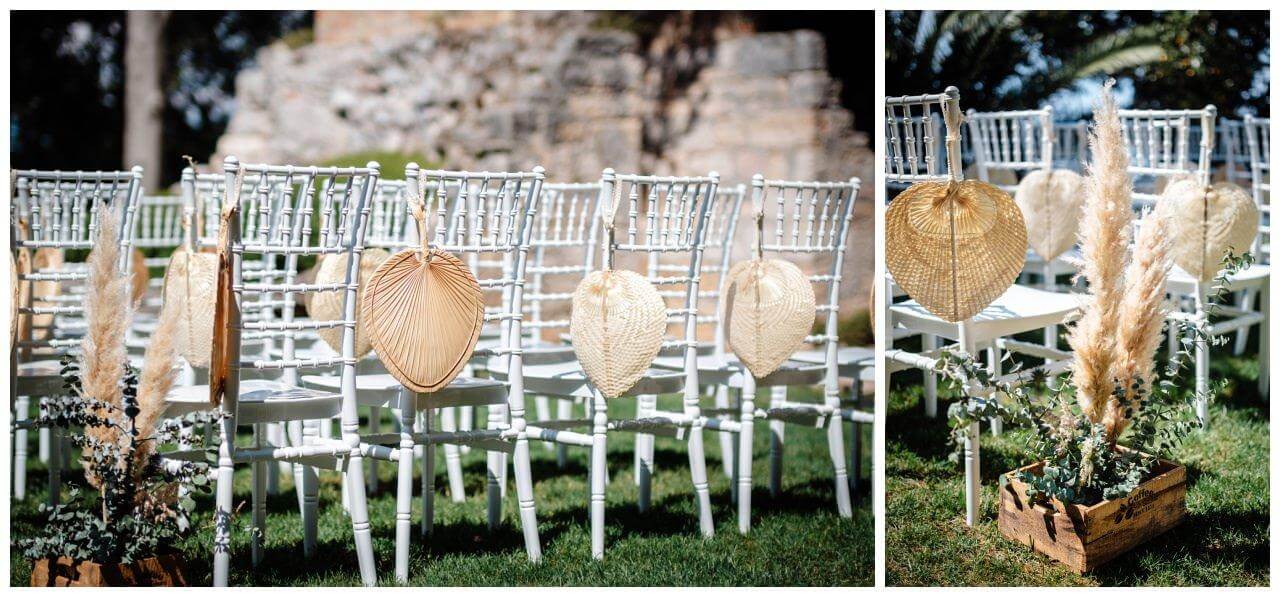 Als Trausetting wählten wir einen Makramee Traubogen in Creme und kombinierten elegant minimalistische Tiffany Stühle dazu. Damit die Gäste nicht ins Schwitzen kamen legten wir Fächer aus Bast hinzu und rundeten so den Boho Look ab.