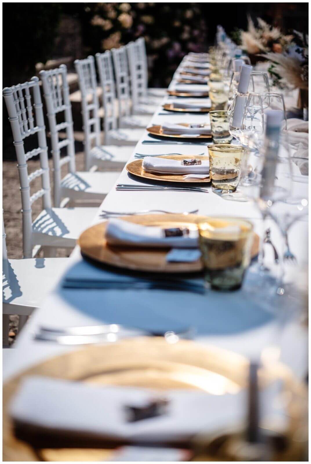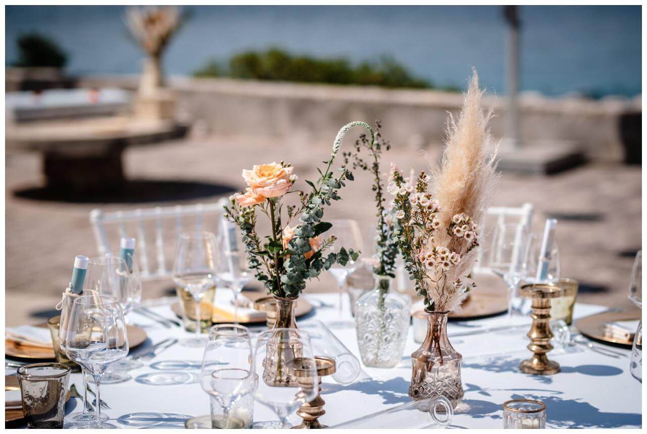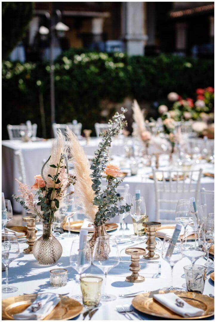 Für das Dinner Setting auf der Terrasse kombinierten wir zum Pampasgras pfirsichfarbene und blaue einzelne Blumen. So sorgten wir für ein luftiges Konzept. Für die, dem Anlass entsprechende, Eleganz sorgten Details in Gold. Ein wunderschönes Hochzeitskonzept für eine Hochzeit am Meer.
